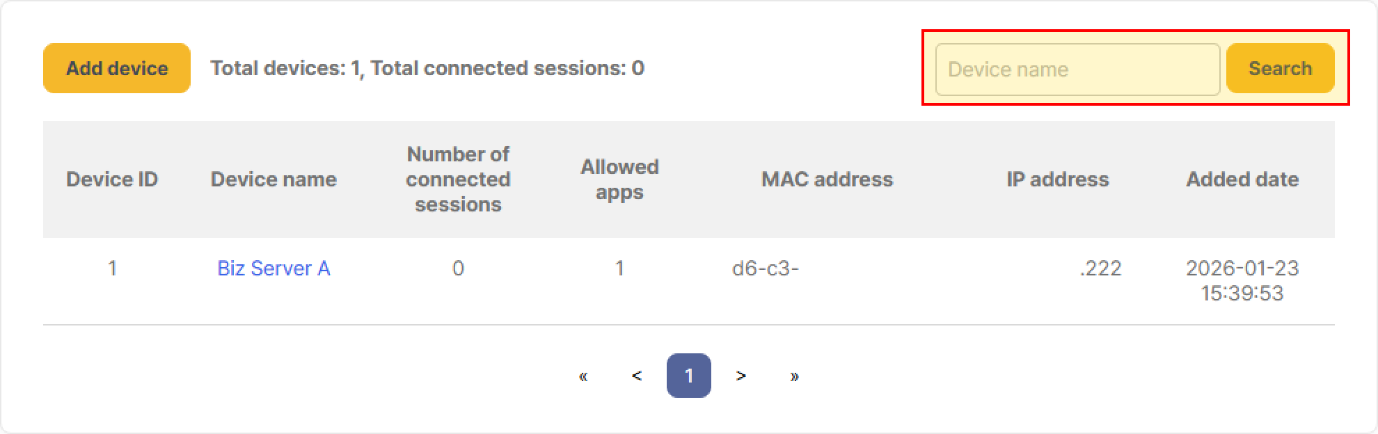 To find a specific device, enter the device name in the search field located at the top right of the table and click [Search]. Partial search is supported; entering a string of characters will return all devices with names containing that string.