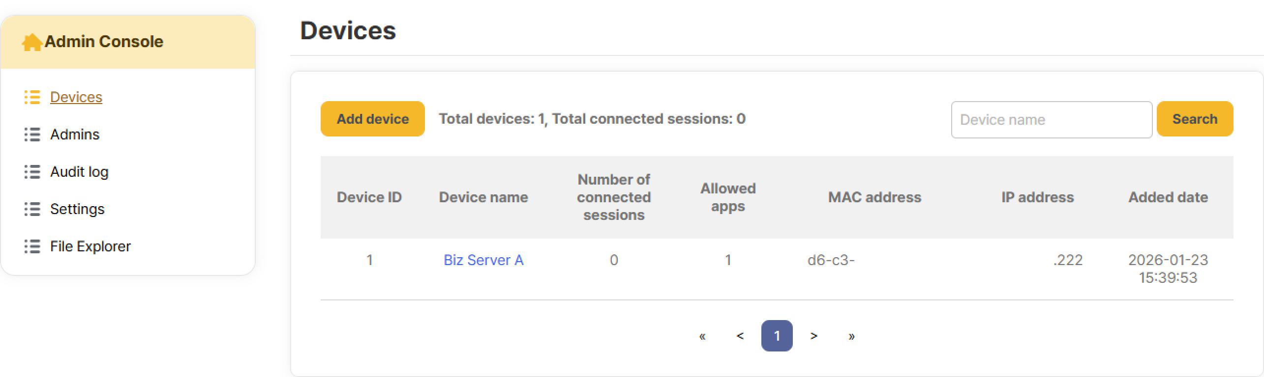 To view the list of registered devices, click [Devices] in the global menu of the Admin Web UI. The Device screen will appear on the right, displaying all currently registered devices in a table format.
