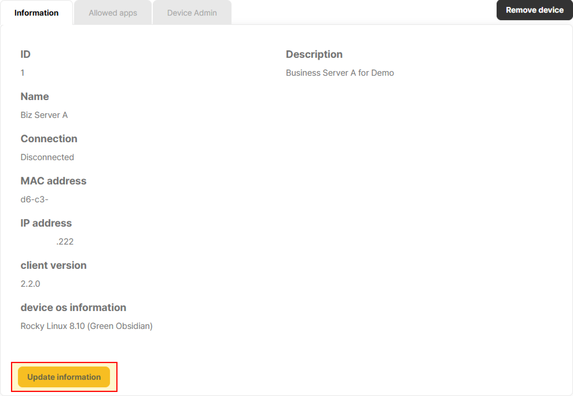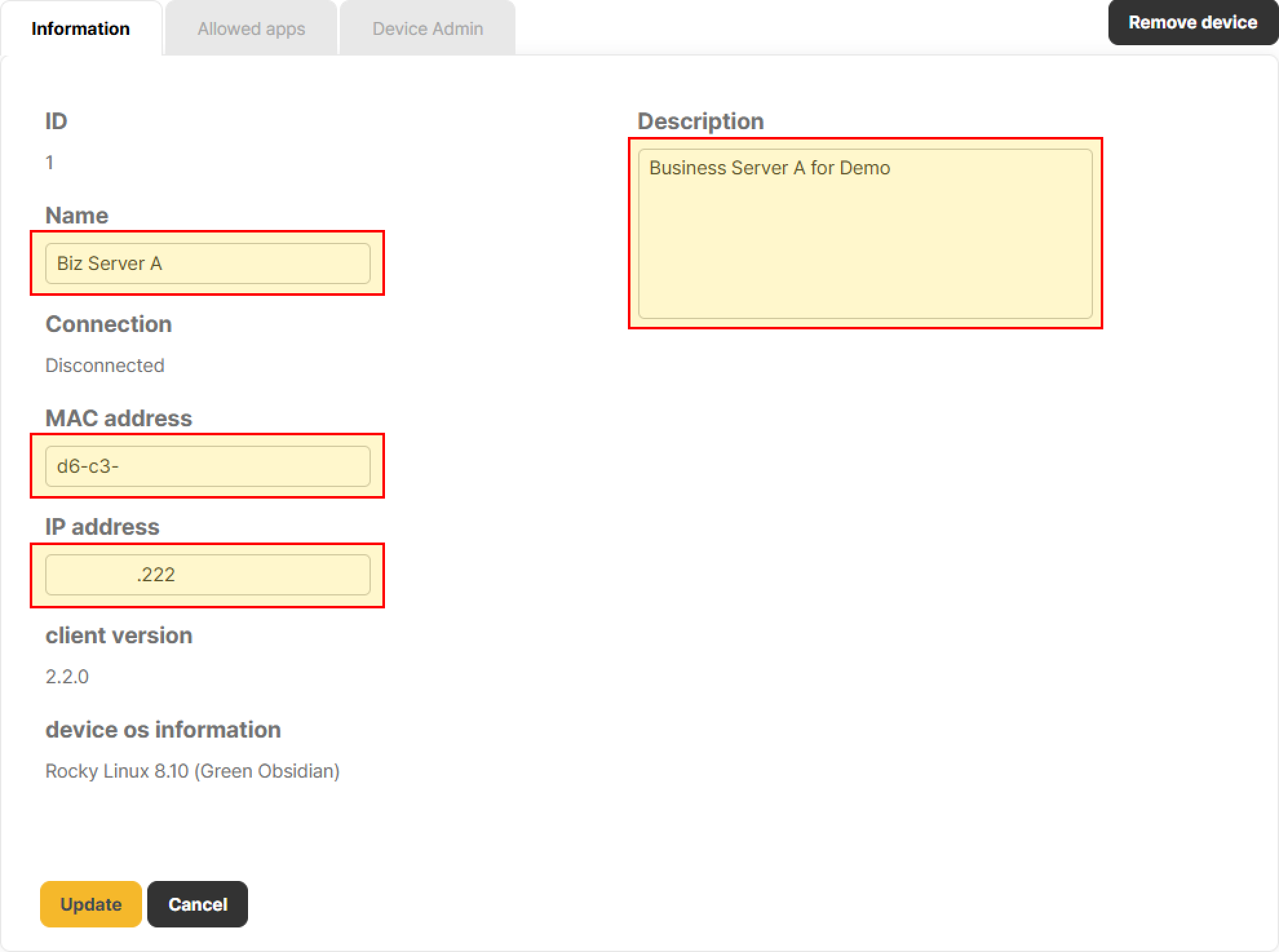 The [Device ID] , [Connection Status], [Client Version], [Device OS Information] fields are automatically assigned by the system and cannot be modified by the administrator.