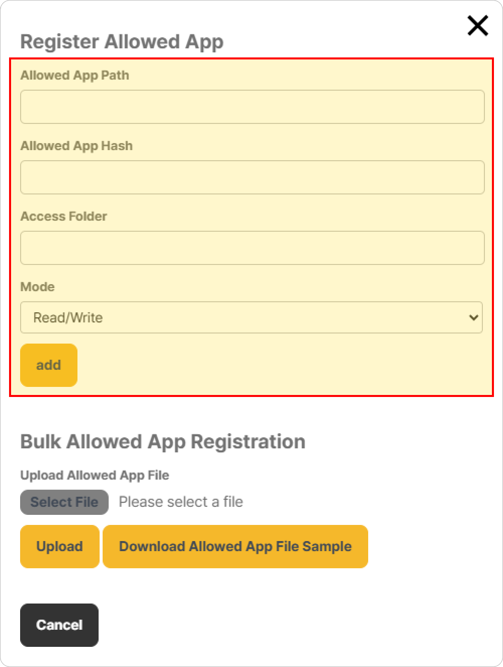 To register multiple applications at once, you can use the bulk upload feature. Click [Download Allowed App Sample File] to download the template. Fill in the application details in the document. Upload the completed file to register all apps simultaneously.