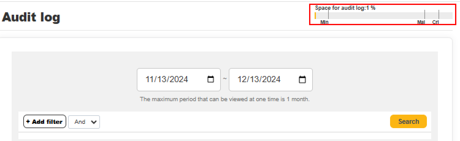 To check the current size of events stored on the FilingBox MEGA2 v2 Server, refer to the bar graph in the top-right corner of the Audit Logs page.