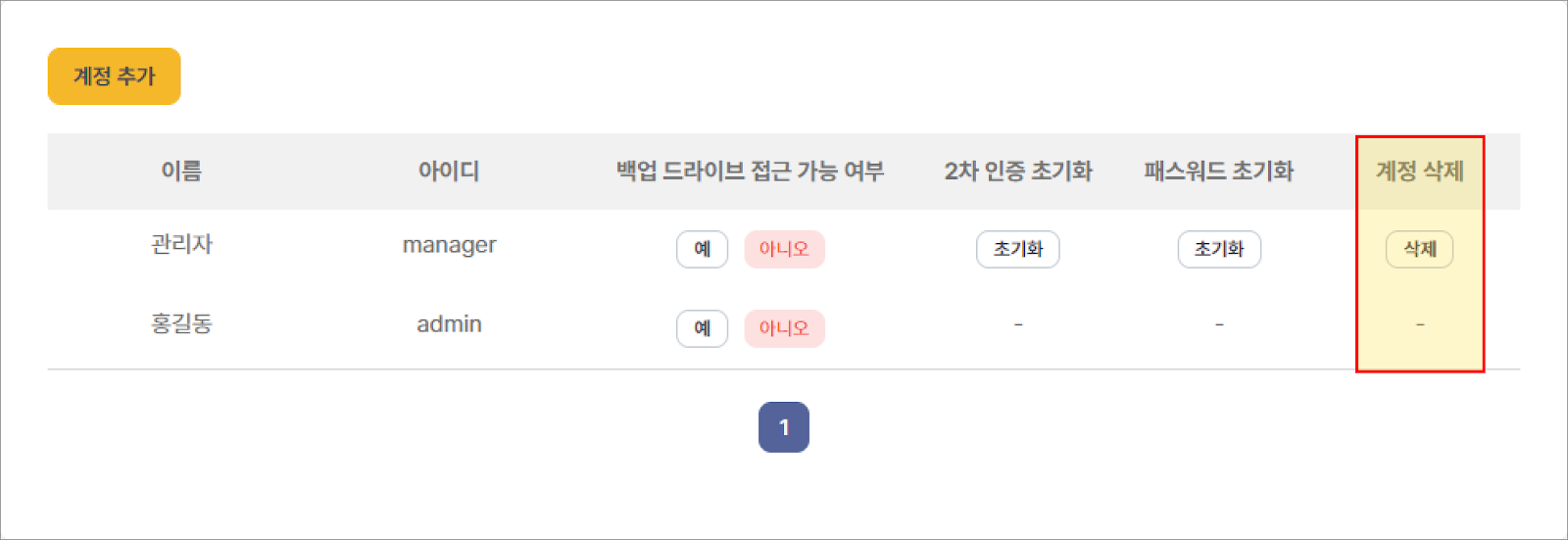 - 관리자 계정 삭제 선택: 관리자 계정 목록 테이블에서 계정 삭제 열을 찾습니다. 삭제하려는 관리자에 해당하는 삭제를 선택합니다.