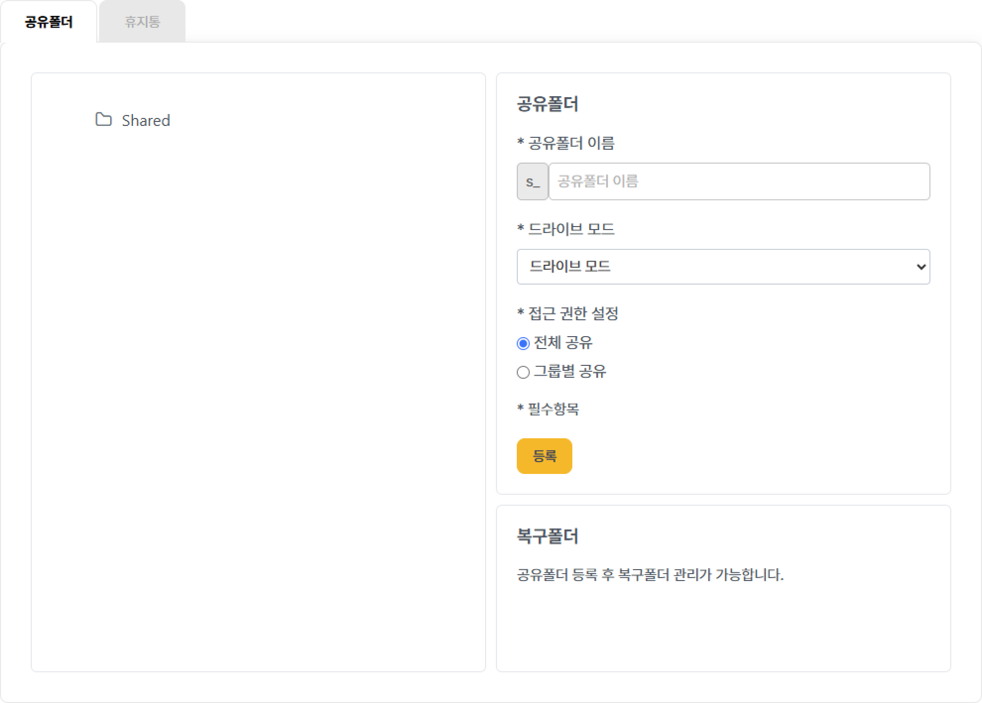- 공유폴더 정보 입력: 추가할 공유폴더의 이름, 드라이브 모드, 접근 권한 설정 정보를 입력합니다.