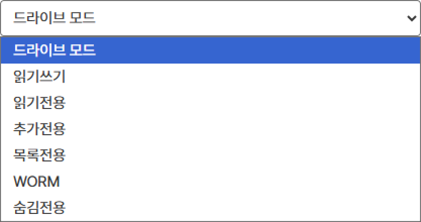 - WORM: Write Once Read Many의 약자로 사용자가 파일을 생성 할 수는 있지만, 그 외 쓰기(수정, 삭제, 이동 등)는 불가능하며, 읽기(열람, 복사 등)를 할 수 있습니다.
