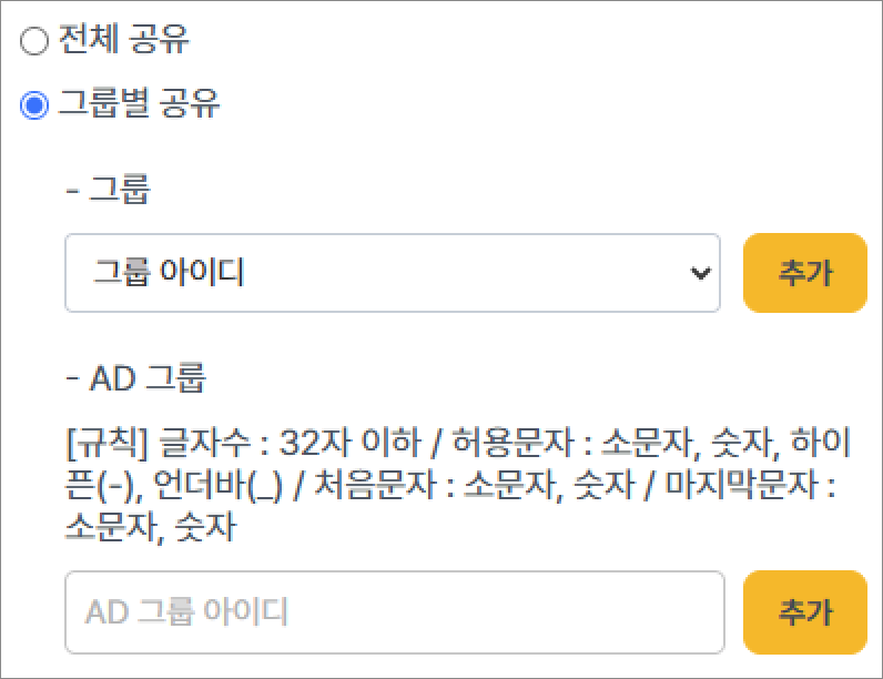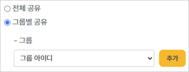 접근 권한 설정: 전체 공유 또는 그룹별 공유를 선택합니다. 그룹별 공유로 선택할 수 있는 그룹은 그룹 관리에서 추가한 그룹과 기본 그룹이 있습니다. 그룹 선택 후 추가를 선택합니다. 여러 개의 그룹을 추가할 수 있습니다.