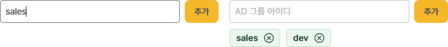 Active Directory 서버에 등록된 실제 그룹 아이디와 동일하게 입력 후, 추가를 선택합니다. 여러 개의 그룹을 추가할 수 있습니다.
