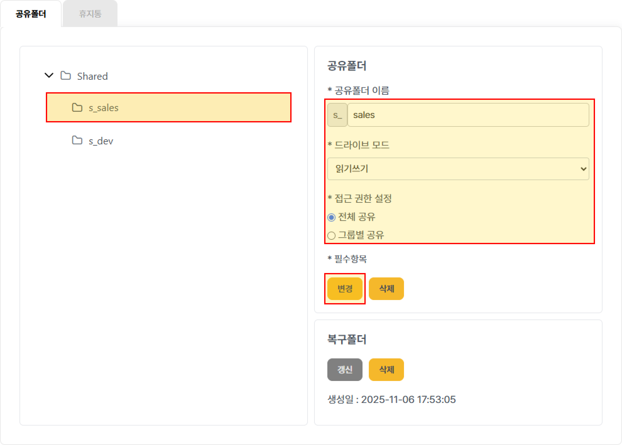 - 공유폴더 변경: 공유폴더 이름, 드라이브 모드, 접근 권한 설정을 변경합니다.