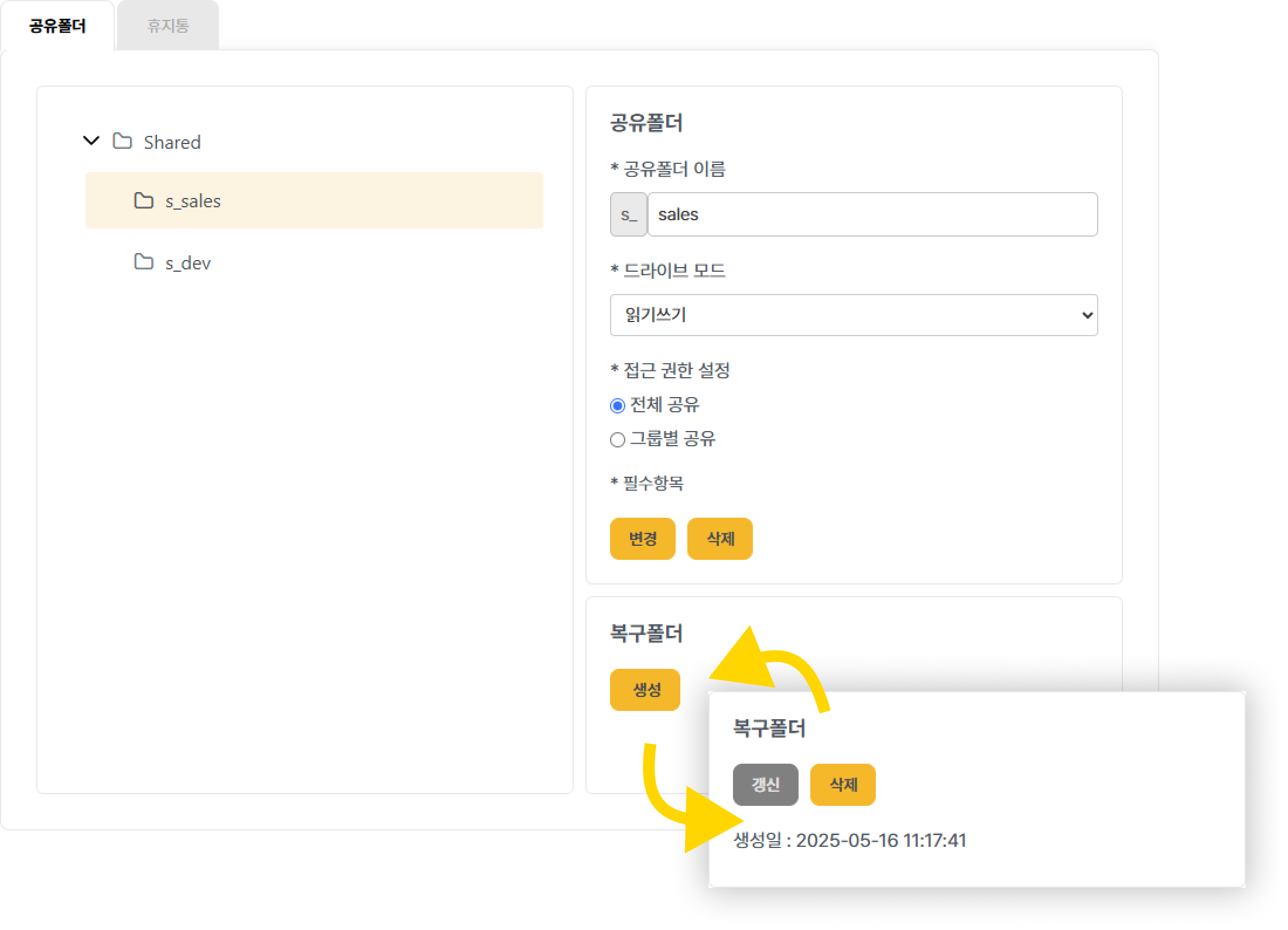 - 복구폴더 생성/갱신/삭제: 복구폴더 영역에서 생성/갱신/삭제 버튼을 선택합니다.