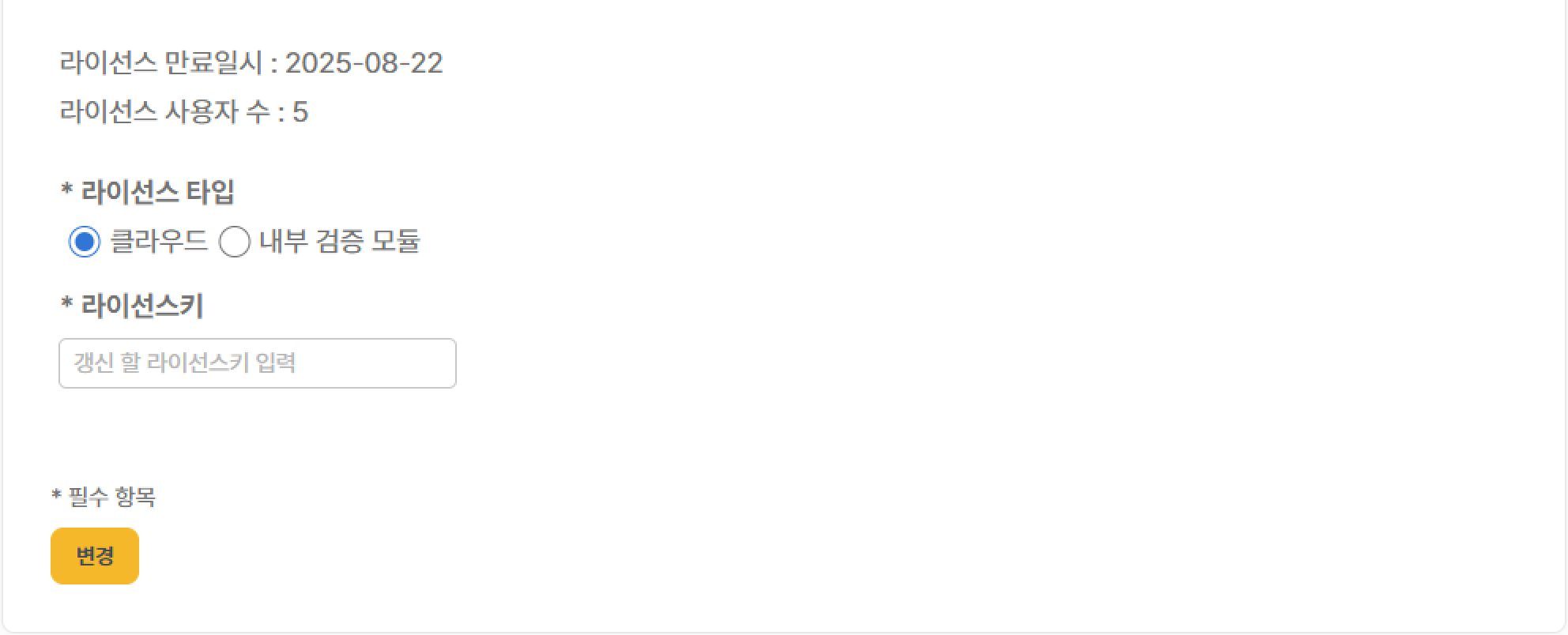 - 라이선스 키 갱신: 새로운 라이선스 키를 등록하는 경우 갱신 할 라이선스 키 타입에 따라 클라우드 또는 내부 검증 모듈을 선택 후 새로운 라이선스 키를 입력합니다.