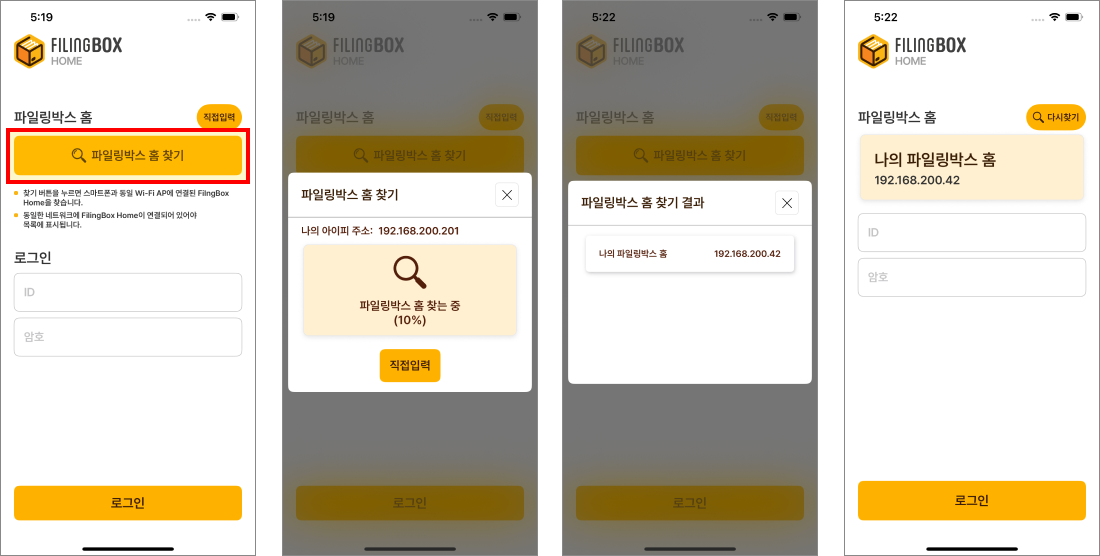 - 파일링박스 기가 앱 설치 및 실행: 스마트폰에 파일링박스 기가 모바일 앱을 설치하고 실행합니다.