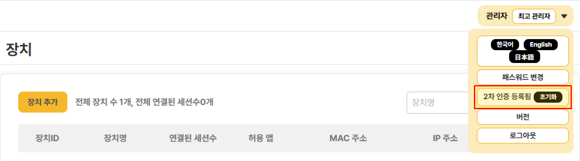 로그인 계정 아래 드롭다운 메뉴가 표시되면, [2차 인증 등록됨 (초기화)] 버튼을 클릭합니다.