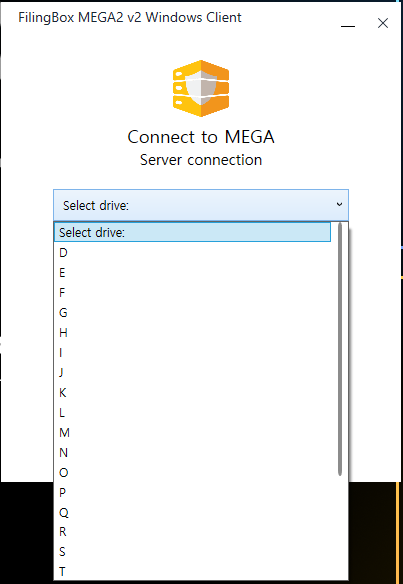 FilingBox MEGA2 v2 Server와 연결할 드라이브를 지정하기 위해서,‘Select drive’ 필드를 클릭하면, 선택할 수 있는 드라이브 목록들이 출력된다.