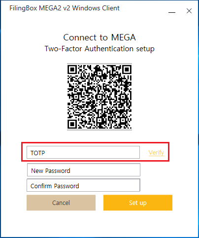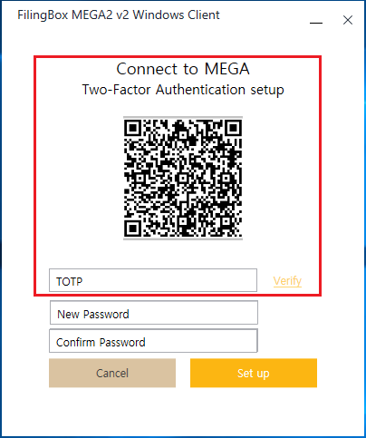 클라이언트에, 최초로, Server 접속 정보를 입력 후, 로그인 아이디와 임시 비밀번호를 입력하면, 아래와 같이, 2차 인증 수단을 등록하는 화면이 출력된다.