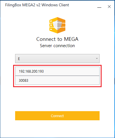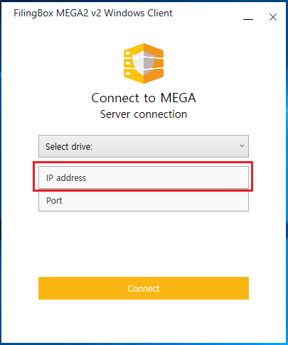- 클라이언트 프로그램이 FilingBox MEGA2 v2 Server에 접속하기 위해서, 아래와 같은, 접속할 FilingBox MEGA2 v2 Server의 정보와 연결할 드라이브 정보를 입력한 후, ‘Connect’ 버튼을 클릭한다.