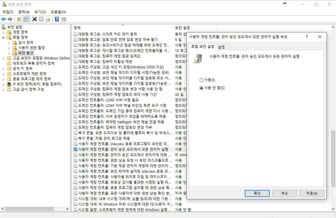 Windows의 로컬 보안 정책 > 로컬 정책 > 보안 옵션 > 사용자 계정 컨트롤: 관리 승인 모드에서 모든 관리자 실행 > 로컬 보안 설정 > 사용 안 함