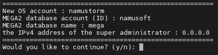 지금까지 설정한 값들이 올바른지 설치자에게 확인을 요청합니다. 설정 값을 확인한 후, 수정이 필요한 경우 'n'을 입력하여시스템 사용자 등록 단계부터 다시 설정을 시작합니다. 설정이 올바르다면 'y'를 입력하여 다음 설치 작업으로 진행합니다.