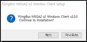 클라이언트 설치 파일을 실행시키면, 아래와 같이, 현재, 설치 중인, FilingBox MEGA2 v2 Windows Client 버전이 표시되며, 계속 진행할지를 물어보는 창이 출력된다. ‘예’ 버튼을 클릭하면, 설치가 시작된다.
