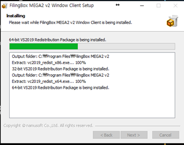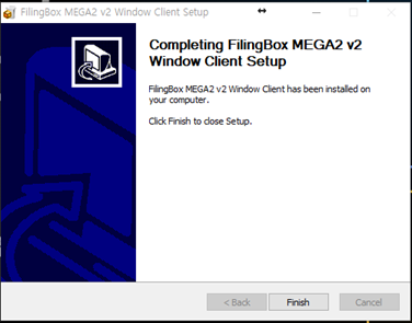 FilingBox MEGA2 v2 Windows Client 동작에 필요한 SW들이 자동으로 설치되고, 관련 파일들을 지정된 디렉토리(“C:\ProgramFiles\FilingBox MEGA2 v2”)에 복사한다.