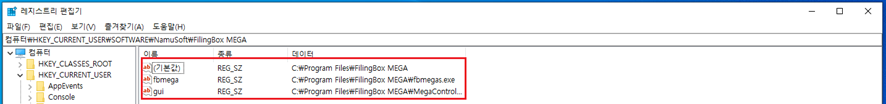 FilingBox MEGA2 v2 Windows Client 동작에 필요한 정보들이 레지스트리에 등록되었는지 확인한다. (“컴퓨터\HKEY_CURRENT_USER\SOFTWARE\NamuSoft\FilingBoxMEGA”)
