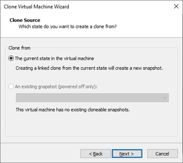 Clone Source 단계에서 The current state in the virtual machine을 선택 후, Next를 선택합니다.