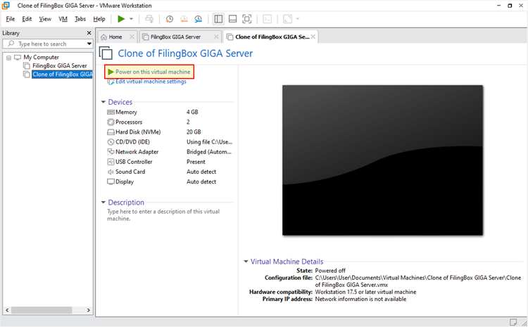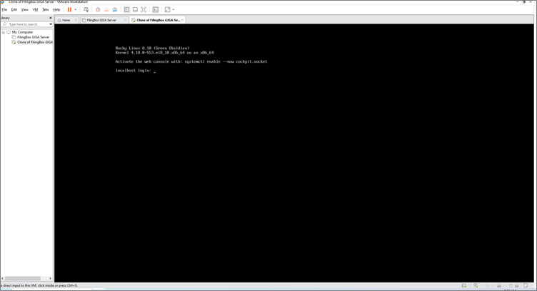 다운로드 받은 FilingBox GIGA Virtual Machine 폴더에서 FilingBox GIGA Server.vmx 파일 열면 VMware Workstation Pro 화면 왼쪽 Library 영역에 FilingBox GIGA Server Vitrual Machine이 추가됩니다.