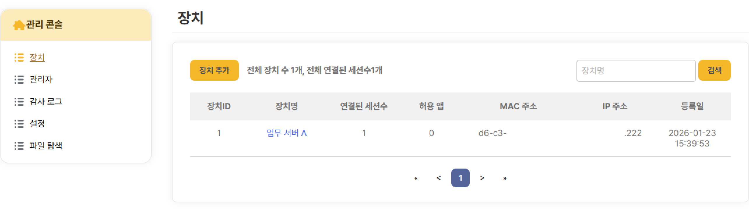 관리자 웹 UI의 글로벌 메뉴에서 [장치]를 클릭하면, 우측에 장치 화면이 표시되며, 현재 등록되어 있는 장치 목록이 테이블 형태로 표시됩니다.