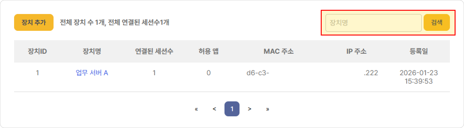 장치 화면에서 특정 장치를 검색하기 위해서는 테이블 우측 상단의 검색 필드에 검색할 장치명을 입력 후 [검색]을 클릭합니다. 장치명의 일부 문자열만 입력하는 것이 가능하며, 이 경우 장치명에 입력한 문자열이 포함된 모든 장치가 검색됩니다.