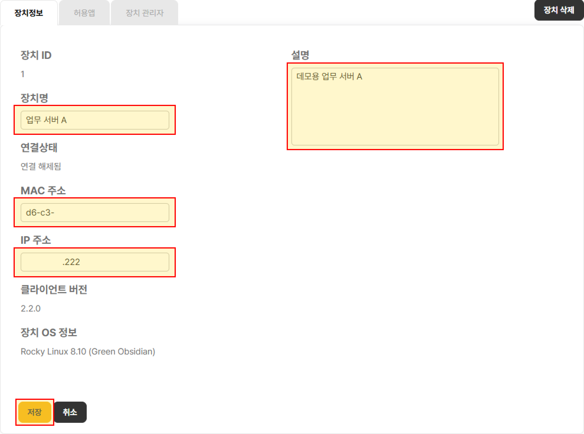 장치 정보 수정 화면에서 수정이 완료된 후, [저장]을 클릭하면, 수정된 내용이 반영됩니다.