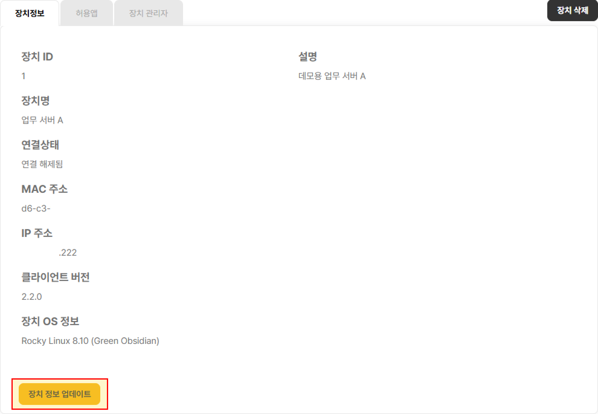 [장치 ID] , [연결상태], [클라이언트 버전], [장치 OS 정보]는, 시스템이 할당하는 값이기 때문에, 관리자가 수정할 수 없습니다.