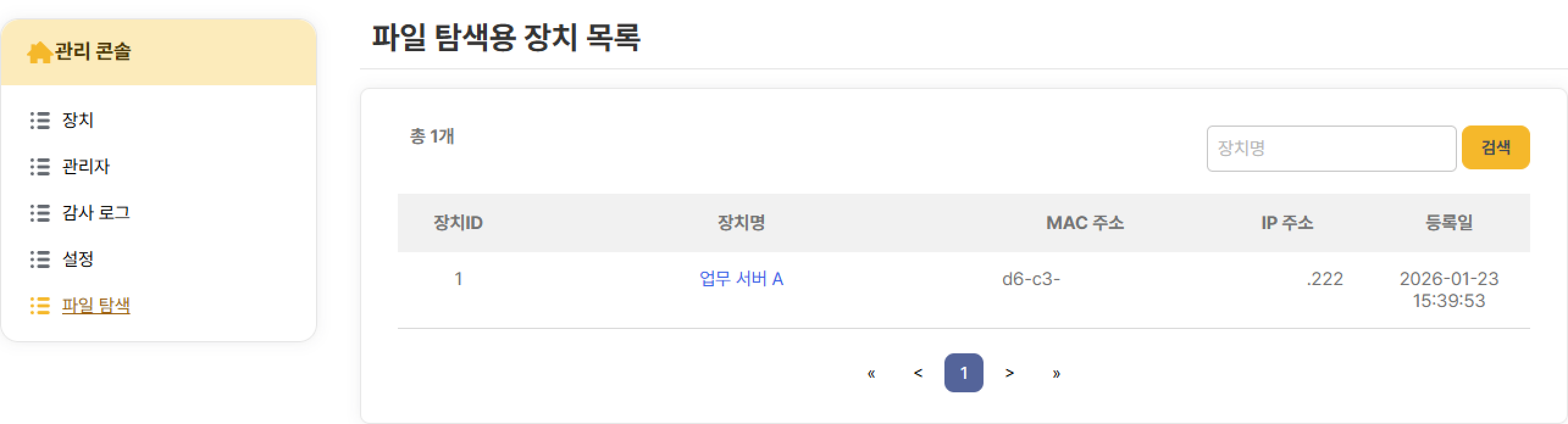 관리자 웹 UI의 글로벌 메뉴에서 [파일 탐색]을 클릭하면, 우측에 파일 탐색용 장치 목록 화면이 표시되며, 현재 등록된 장치 목록이 테이블 형태로 표시됩니다.