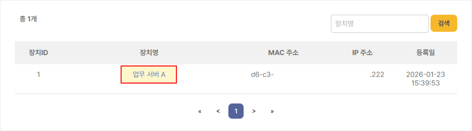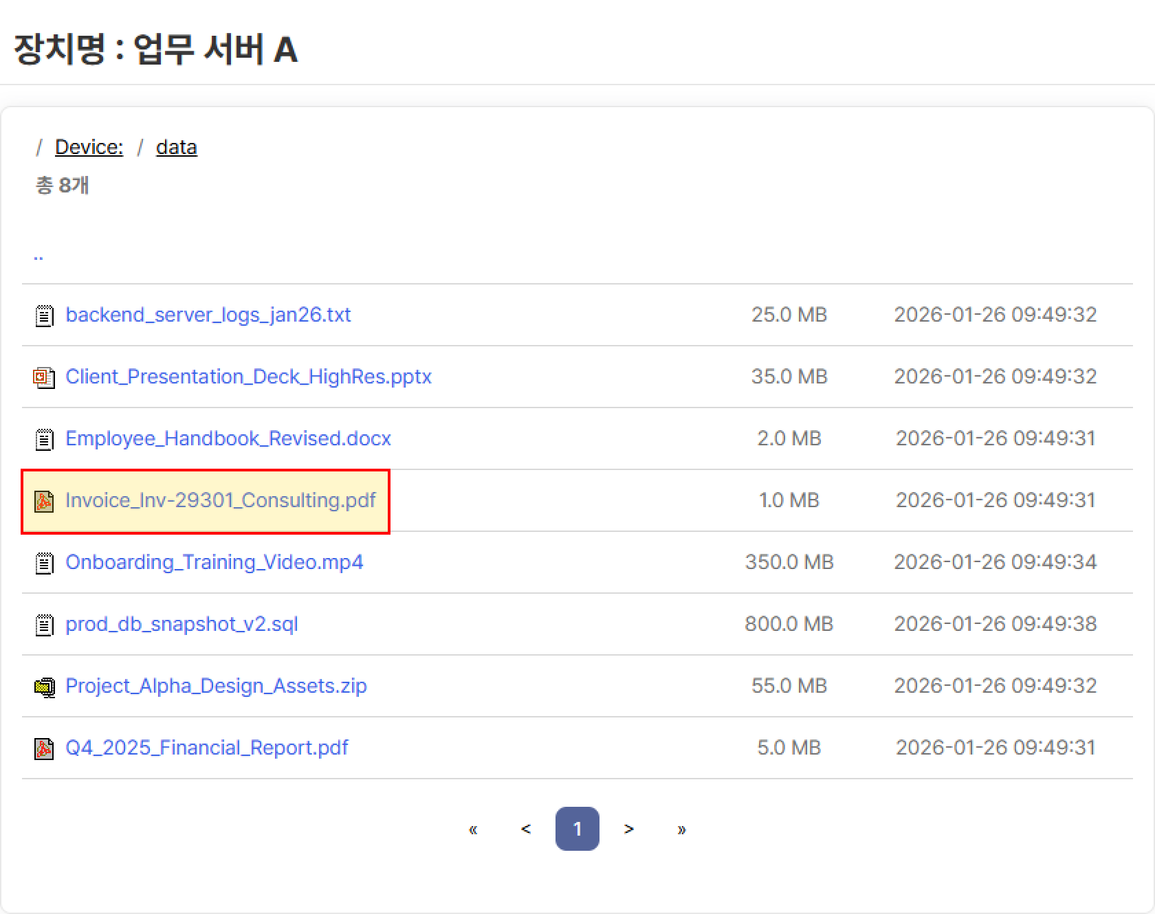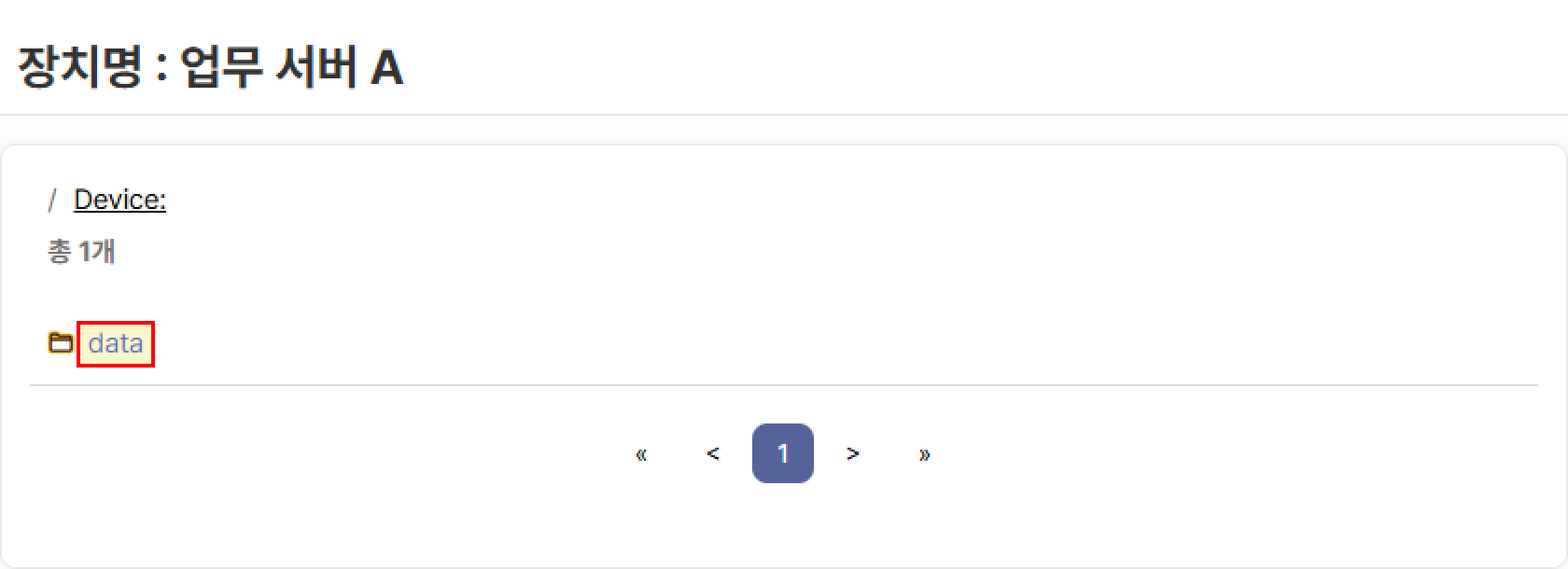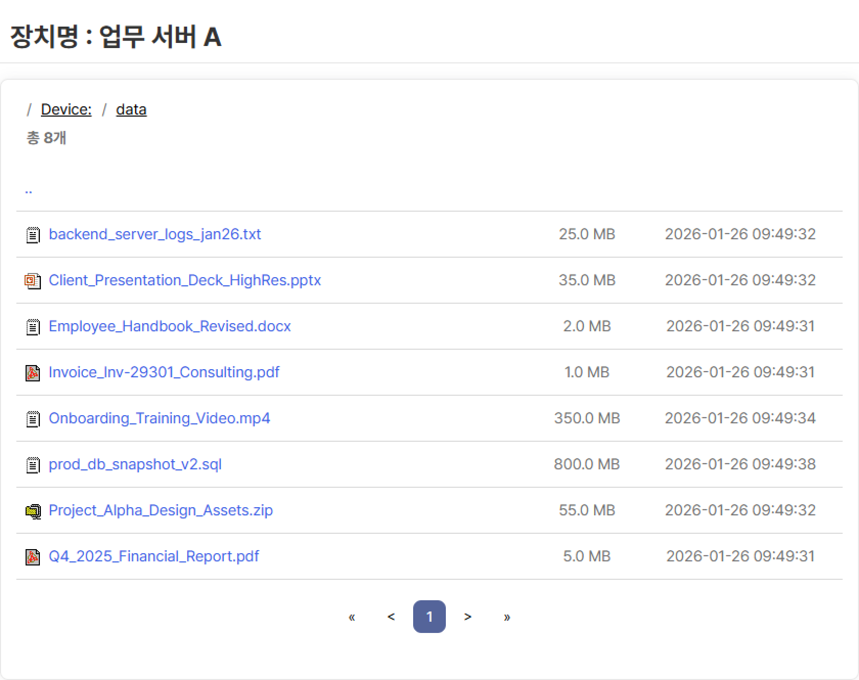파일을 조회하려는 장치의 장치명을 클릭하면, 해당 장치의 파일 목록을 조회할 수 있는 화면이 표시됩니다. Linux 장치인 경우 볼륨명을 클릭하면, 해당 장치에 저장된 파일 목록을 조회할 수 있습니다.
