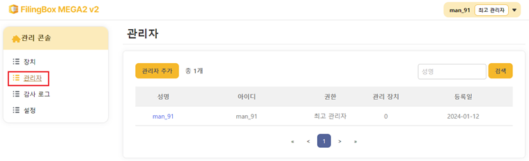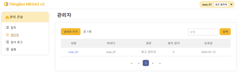 좌측의 [관리자] 메뉴를 클릭하면, 우측에 현재 등록되어 있는 관리자들의 목록이 표시됩니다.