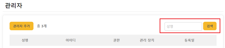 관리자 페이지에서 특정 관리자를 검색하기 위해서는 검색 필드에 검색할 관리자명 입력 후, [검색]을 클릭합니다. 관리자 명 입력 시, 관리자 명의 일부 문자열만 입력하는 것이 가능합니다. 성명에 입력한 문자열이 포함된 모든 관리자가 검색됩니다.