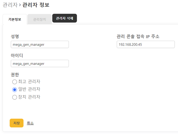 관리 콘솔 접속 IP 주소’ 필드는 ‘권한’을 ‘일반 관리자’로 지정하였을 경우에만, 표시됩니다.