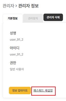 특정 관리자의 로그인 비밀번호를 재 설정하기 위해서는 관리자 화면에서 수정하려는 관리자의 ‘성명’을 클릭한 후, 해당 관리자의 상세 정보 페이지가 출력되면, 이 페이지의 하단에 표시된 ‘패스워드 재설정’ 버튼을 클릭합니다. ‘패스워드 재설정’ 버튼을 클릭하면, 패스워드를 재 설정할 수 있는 화면이 출력되며, 이 화면에서 임시 비밀번호를 설정합니다.