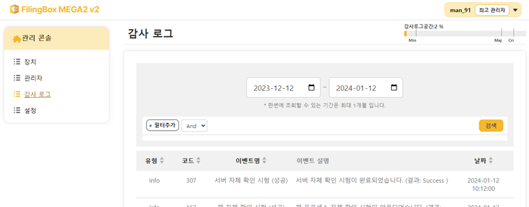 좌측의 [감사 로그] 메뉴를 클릭하면 우측에 현재 FilingBox MEGA 서버에 저장되어 있는 이벤트들이 표시됩니다. 특정 기간 동안 발생된 이벤트들을 조회할 수 있으며, 기본적으로 검색하는 기간은 오늘 날짜 기준으로 1개월 전(지난 달의 같은 날짜)입니다.