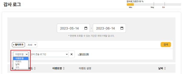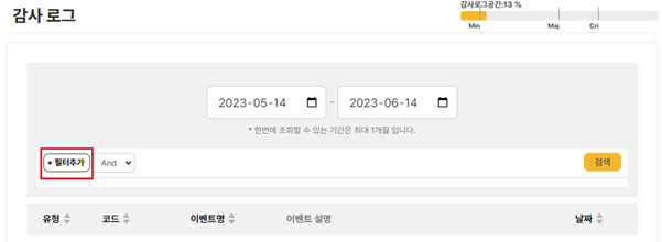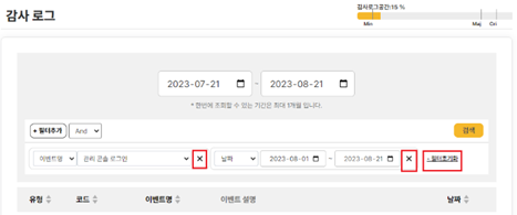 감사 로그 필터링 감사 로그 화면에 좌측 상단의 [필터추가] 버튼을 클릭하면, 여러 필터를 조합하여 조회할 수 있습니다.이 목록에서 출력되는 [이벤트명]과 [이벤트 코드]에 대한 정보는 기타>이벤트 코드 를 참고합니다.생성한 필터들 중에 특정 필터를 삭제하고 싶으면, 등록되어 있는 필터의 우측 끝에 있는 [X] 버튼을 클릭합니다. 생성한 필터들 전체를 한꺼번에 삭제하고 싶으면, [필터 초기화] 버튼을 클릭합니다.