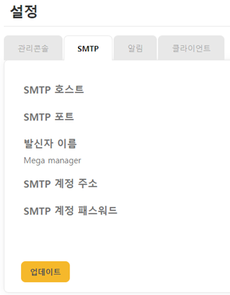 이벤트 발생 시, 지정된 주소로 이벤트와 관련된 이메일을 발송하기 위해서는, 아래와 같은 정보들을 사전에 설정해야 합니다. 설정을 하기 위해서는, SMTP 탭 페이지 하단의 [업데이트] 버튼을 클릭해야 합니다.