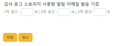 감사 로그 스토리지 사용량 알림 이메일 발송 기준: 시스템 디스크 사용량에 영향을 줄 수 있는 이벤트 정보들은 계속 누적됩니다. 이를 관리하기 위해 저장 용량 기준으로 3개의 임계값(threshold)을 설정하며, 저장된 이벤트 양이 각 임계값을 초과할 때마다 관리자에게 알림 이벤트가 발생합니다.