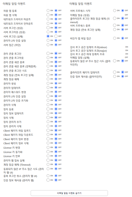 이메일 알림 이벤트: 시스템에서 발생시킬 수 있는 모든 이벤트들의 목록이 표시되며, 해당 이벤트 발생 시,이메일을 발송할 지 여부를 설정할 수 있습니다.