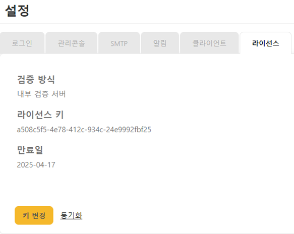 라이선스 키 정보 변경을 위해서는 ‘키 변경’ 버튼을 클릭한 후, 필요한 정보를 수정합니다.