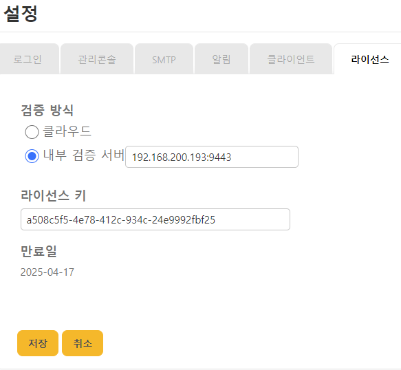 서버가 설치된 환경 내에 별도의 라이선스 키 검증 시스템을 구축하고, 이 시스템을 통해 유효성을 검증하는 방식입니다. 이 방식을 선택할 경우, 내부 검증 서버의 IP 주소와 포트 정보를 입력해야 합니다.