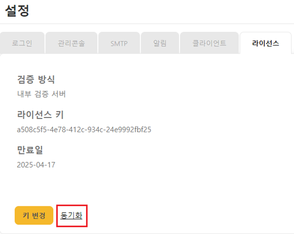 FilingBox MEGA는 주기적으로 키 검증 서버에게 서버 내부에 설정되어 있는 라이선스 키의 유효성 점검 및 정보 동기화를 진행합니다. 라이선스 기간, 옵션 등의 정보를 즉각 반영하고 싶은 경우 [동기화] 버튼을 클릭하면 그 시점에 바로 동기화를 요청하게 됩니다.